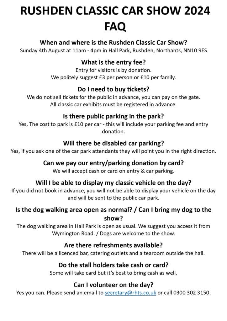 Classic Car Show in Hall Park, Rushden on Sun 4th August.
