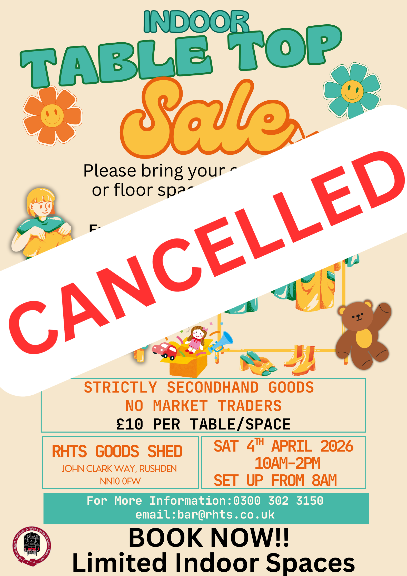 Come to the Goods Shed for a table top sale. Pitches available by emailing Marisa at bar@rhts.co.uk - Second hand items only Public entry only 50p on the door Parking on site